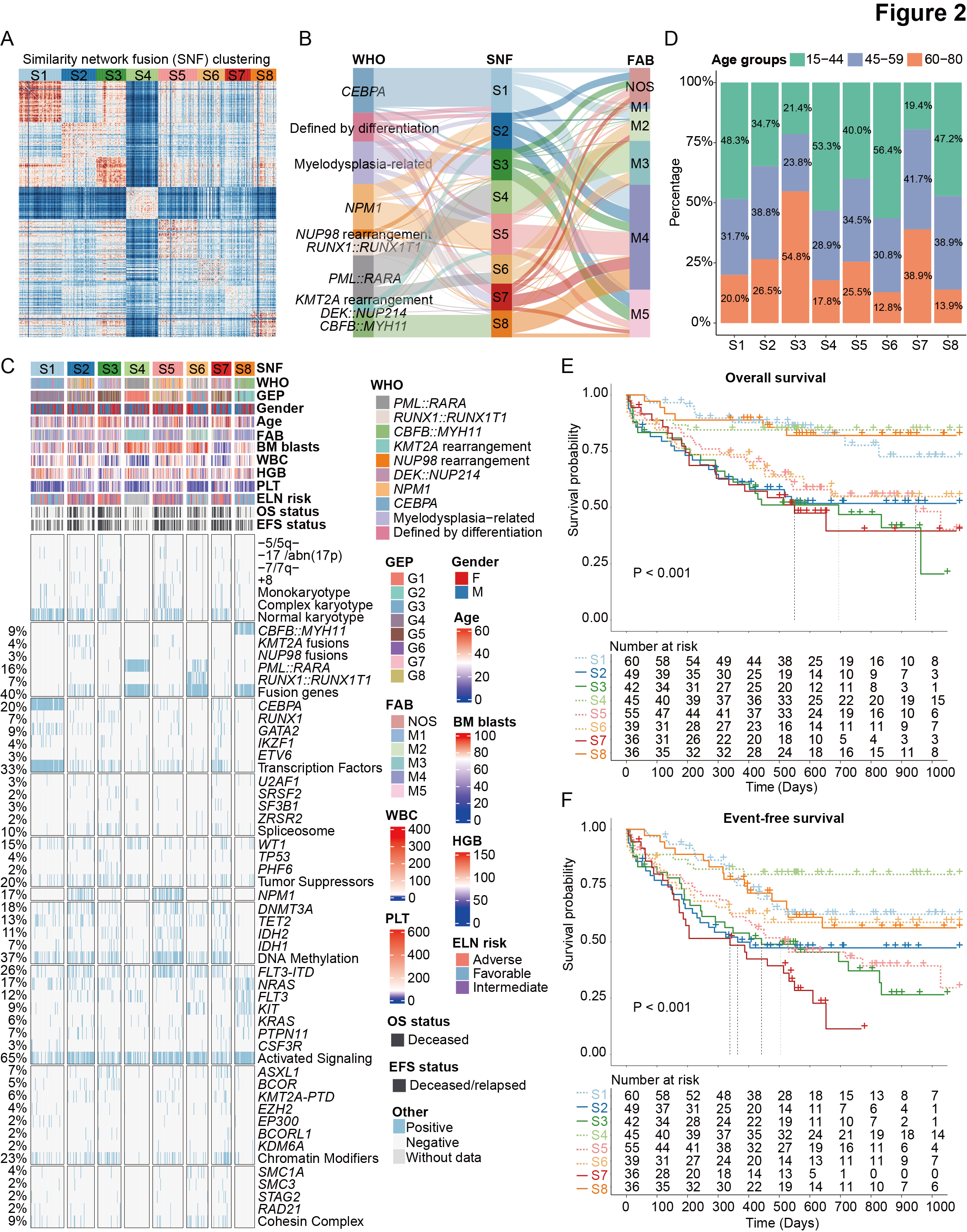 E-F. Kaplan-Meier curves for overall survival (E) and event-free survival (F) of AML patients stratified by the eight proteomic subtypes.