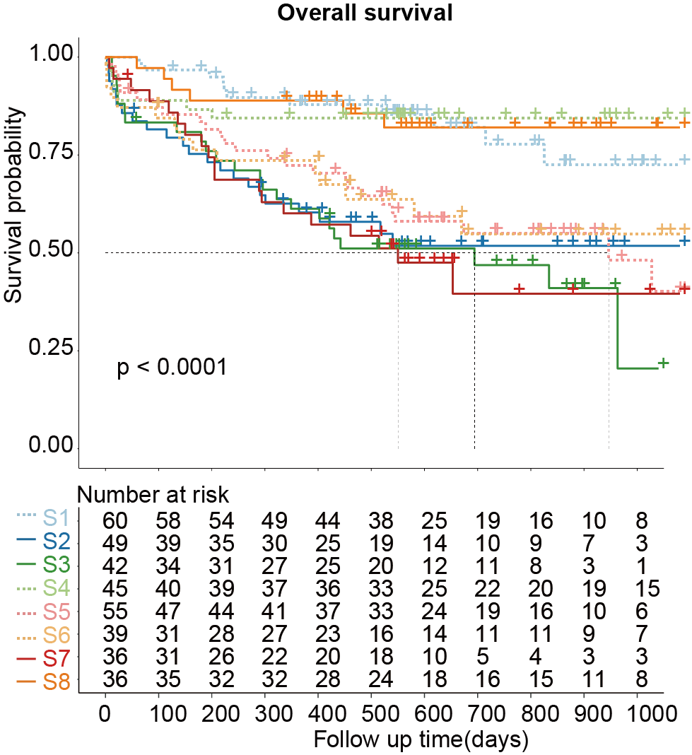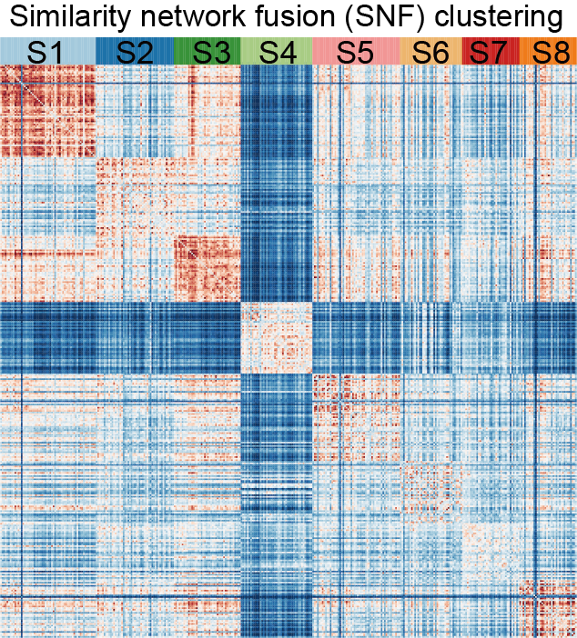 The discrimination of eight proteomic subtypes (S1-S8) based on similarity network clustering (SNF) method.
