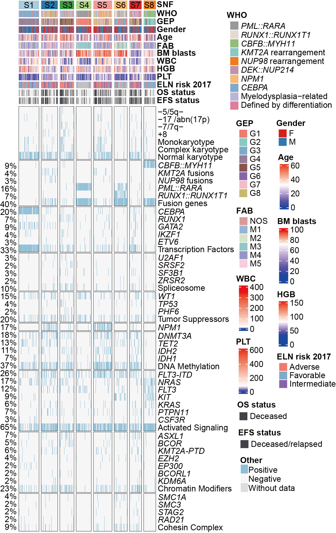 C. Heatmap of clinical features, cytogenetic groups, and recurrent gene fusions and mutations in AML, which are classified into diverse functional groups (Ley TJ et al., N Engl J Med. 2013). Each column represents a patient and is arranged according to the proteomic clusters through S1-S8. “FLT3” refers to other FLT3 mutations except for FLT3-ITD, including FLT3-TKD mutations and mutations at other sites of this gene.