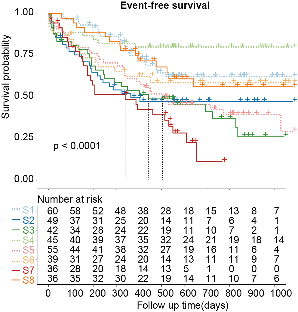 Kaplan-Meier curves for event-free survival of AML patients stratified by the eight proteomic subtypes.