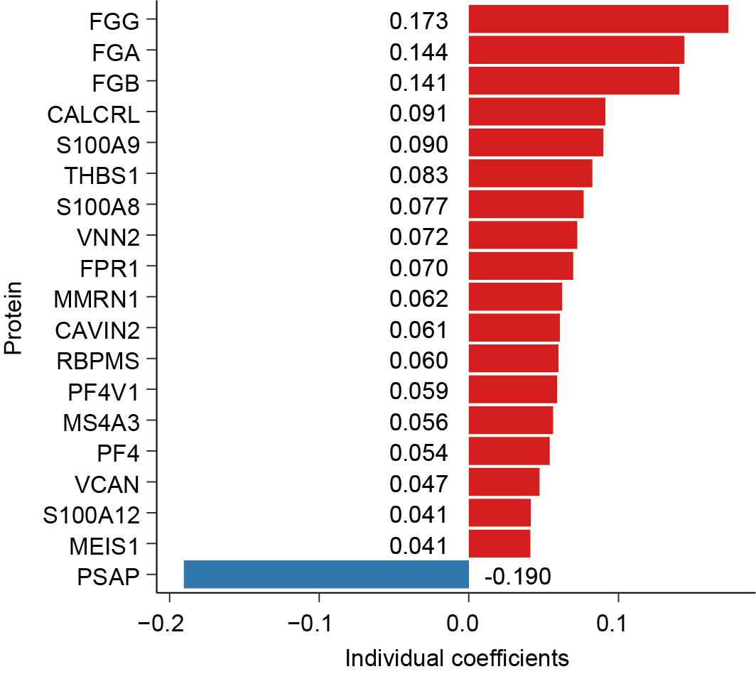 The final score is calculated as the weighted sum of abundance of the 19 proteins. Proteins in red and blue are predictive for a poor and good prognosis, respectively. Coefficients of these proteins in univariate Cox regression analysis are denoted.