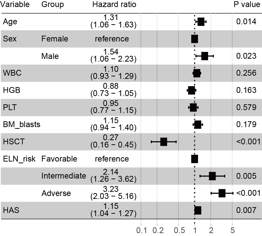 Surv(OS, OS_status) ~ Age + Sex + WBC + HGB + PLT + BM_blasts + HSCT + ELN_risk_2017 + HAS,