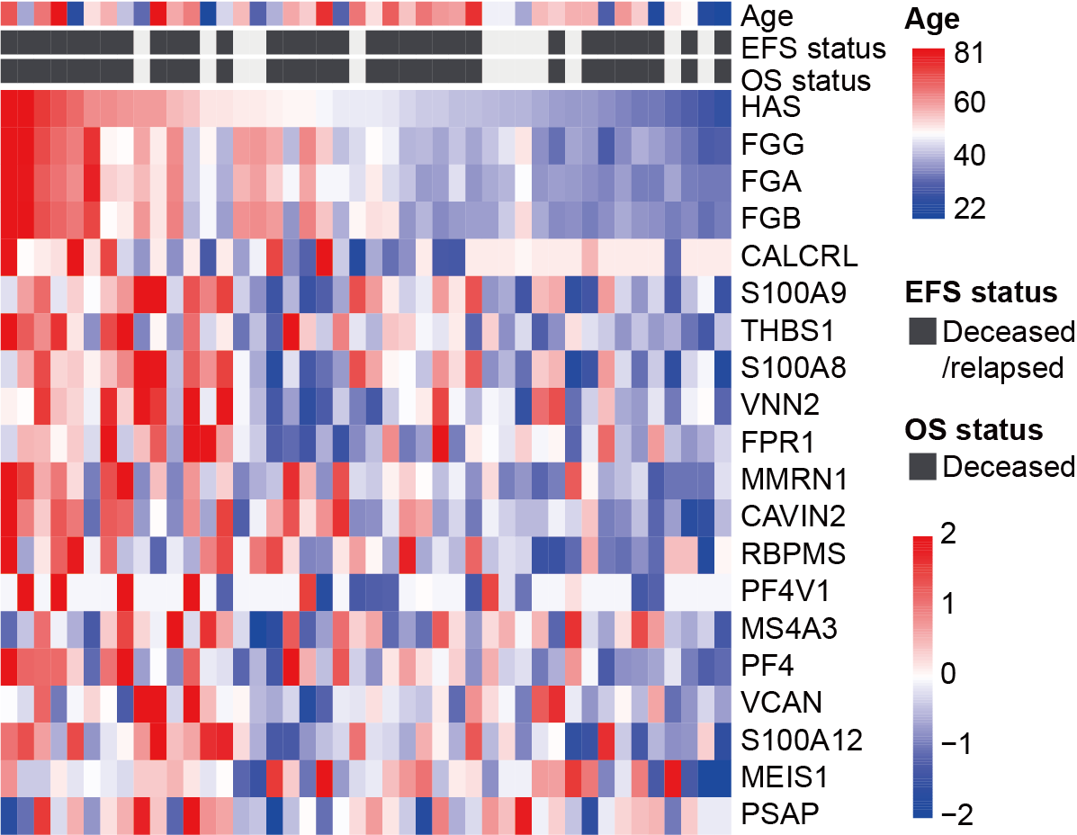 Heatmap showing the established HAS and the abundance of the 19 proteins, with patients arranged according to the magnitude of their scores. Age and prognosis of patients are annotated above the heatmap.