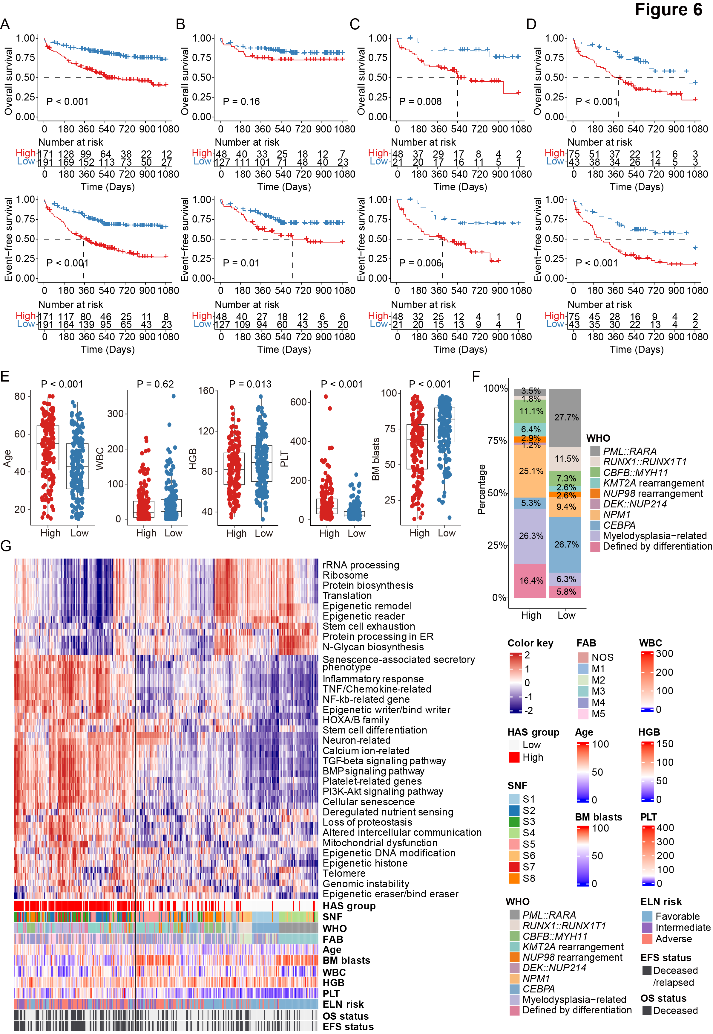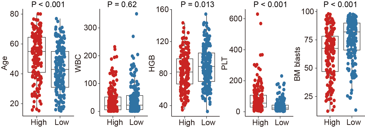 E. Comparison of age, WBC, HGB, PLT count, and BM blasts at diagnosis between high and low HAS groups.