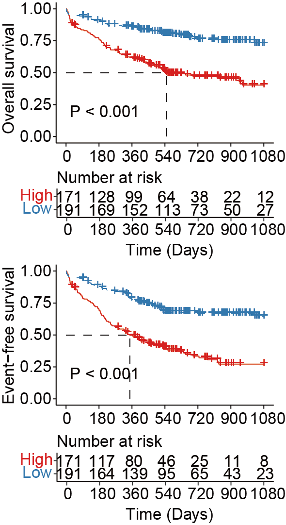 Kaplan-Meier curves for overall survival (upper panels) and event-free survival (lower panels) in all AML patients with favorable
