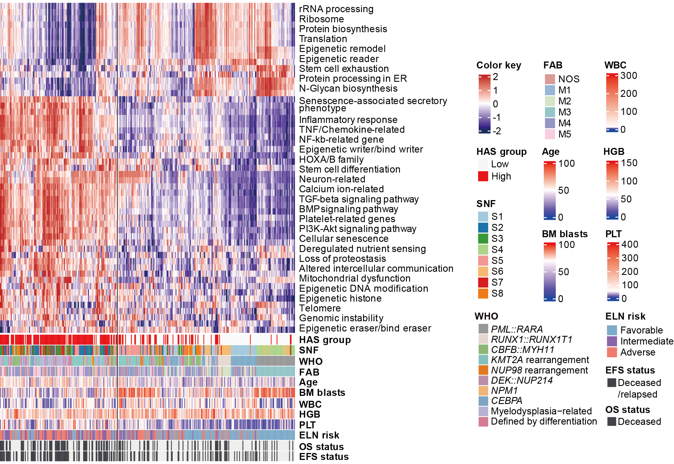 G. Heatmap demonstrating the enrichment of known aging-associated pathways in AML, including aging hallmarks, epigenetic gene sets, and our previously reported age-related enriched pathways. The HAS group and clinical features of patients are annotated below the heatmap. Each column represents a patient.