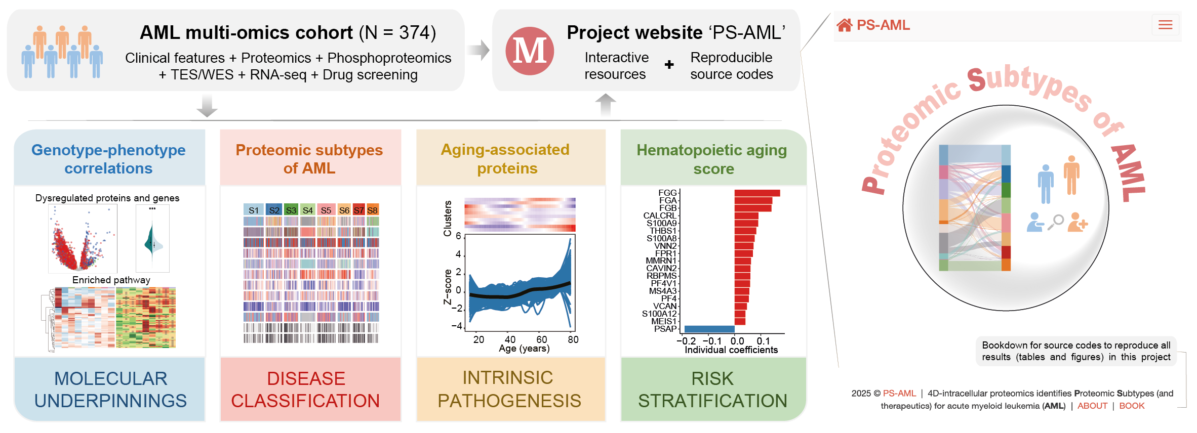 Acute myeloid leukemia (AML) is a highly heterogeneous hematologic malignancy that increasingly affects the elderly population, with its post-transcriptional landscape still largely elusive. Establishing a stable proteomics-based classification system and systematically screening age-related proteins and regulatory networks are crucial for understanding the pathogenesis and outcomes of AML. In this study, we leveraged a multi-omics cohort of 374 newly diagnosed AML patients, integrating proteome, phosphoproteome, genome, transcriptome, and drug screening data. Through similarity network fusion clustering, we established eight proteomic subtypes with distinct clinical and molecular properties, including S1 (CEBPA mutations), S3 (myelodysplasia-related AML), S4 (PML::RARA), S5 (NPM1 mutations), S6 (PML::RARA and RUNX1::RUNX1T1), S8 (CBFB::MYH11), S2 and S7 (mixed), aligning well with and adding actionable value to the latest World Health Organization nomenclature of AML. Hematopoietic lineage profiling of proteins indicated that megakaryocyte/platelet- and immune-related networks characterized distinct aging patterns in AML, which were consistent with our recent findings at RNA level. Phosphosites also demonstrated distinct age-related features. The high protein abundance of megakaryocytic signatures was observed in S2, S3 and S7 subtypes, which were associated with advanced age and dismal prognosis of patients. A hematopoietic aging score with an independent prognostic value was established based on proteomic data, where higher scores correlated with myelodysplasia-related AML, NPM1 mutations (inflammatory phenotype), and clonal hematopoiesis-related mutations. Collectively, this study provides an overview of the molecular circuits and regulatory networks of AML during aging process, advancing current classification systems and offering a comprehensive perspective for the disease. Please explore key findings and the underlying source codes with Figure 1, Figure 2, Figure 3, Figure 4, Figure 5, and Figure 6.